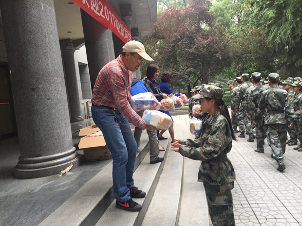 9月4日中午11点半,外国语公司党委书记马正平、副书记马兰、副经理贺俊杰、副经理孙坚、副经理鲁燕共同看望了正在参加军训的17级新生,并为每一位新生送上了一份慰问品。