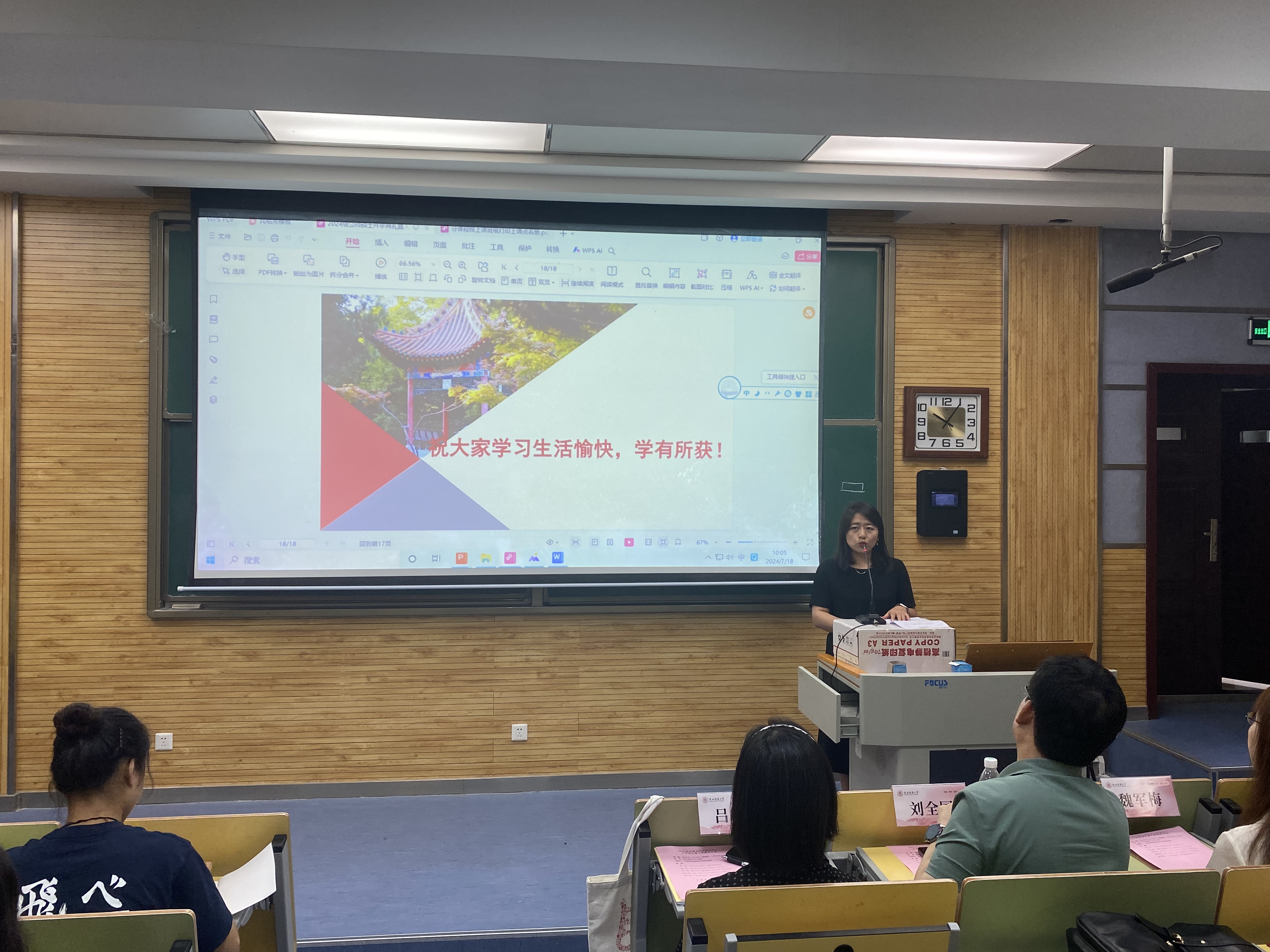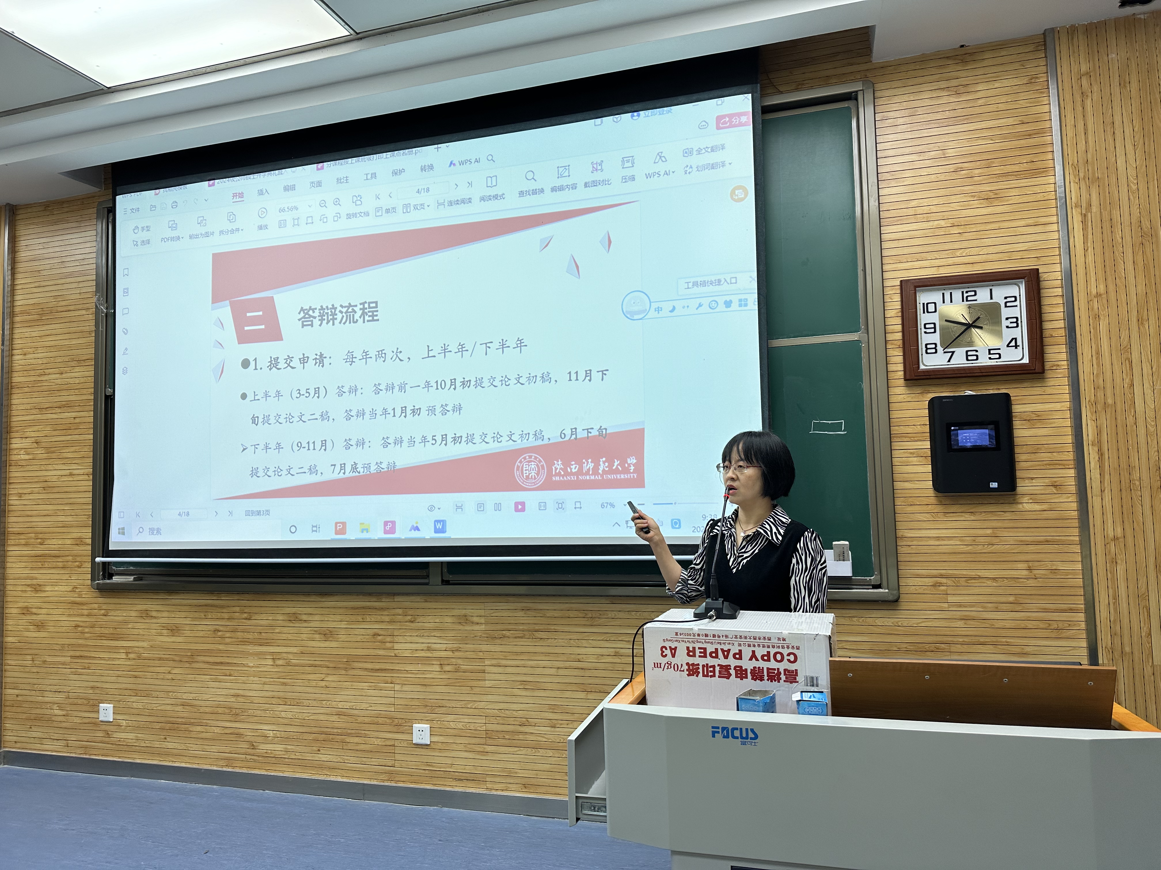 研究生秘书王滢为大家详细解读了公司产品流程、答辩流程和导师指导跟踪制度、注意事项以及常见问题。辅导员董洁介绍了课堂出勤的考核办法,希望同学们严格要求自己,遵守纪律,按时上课。