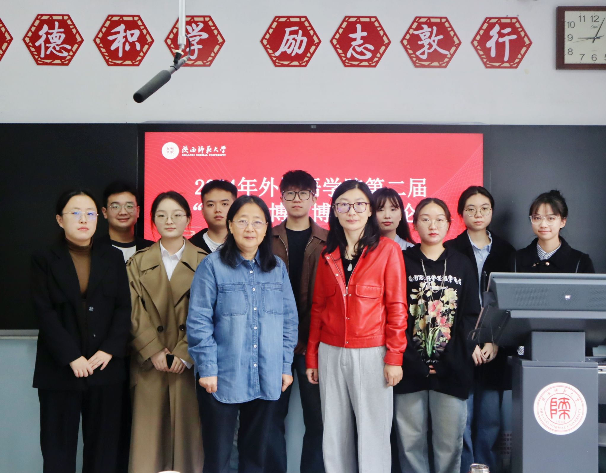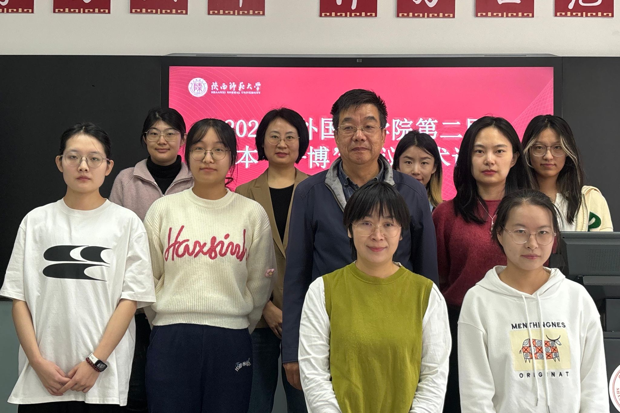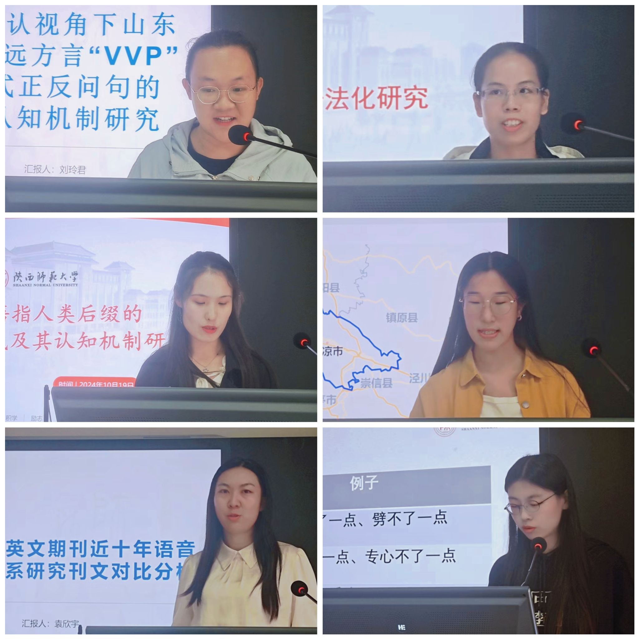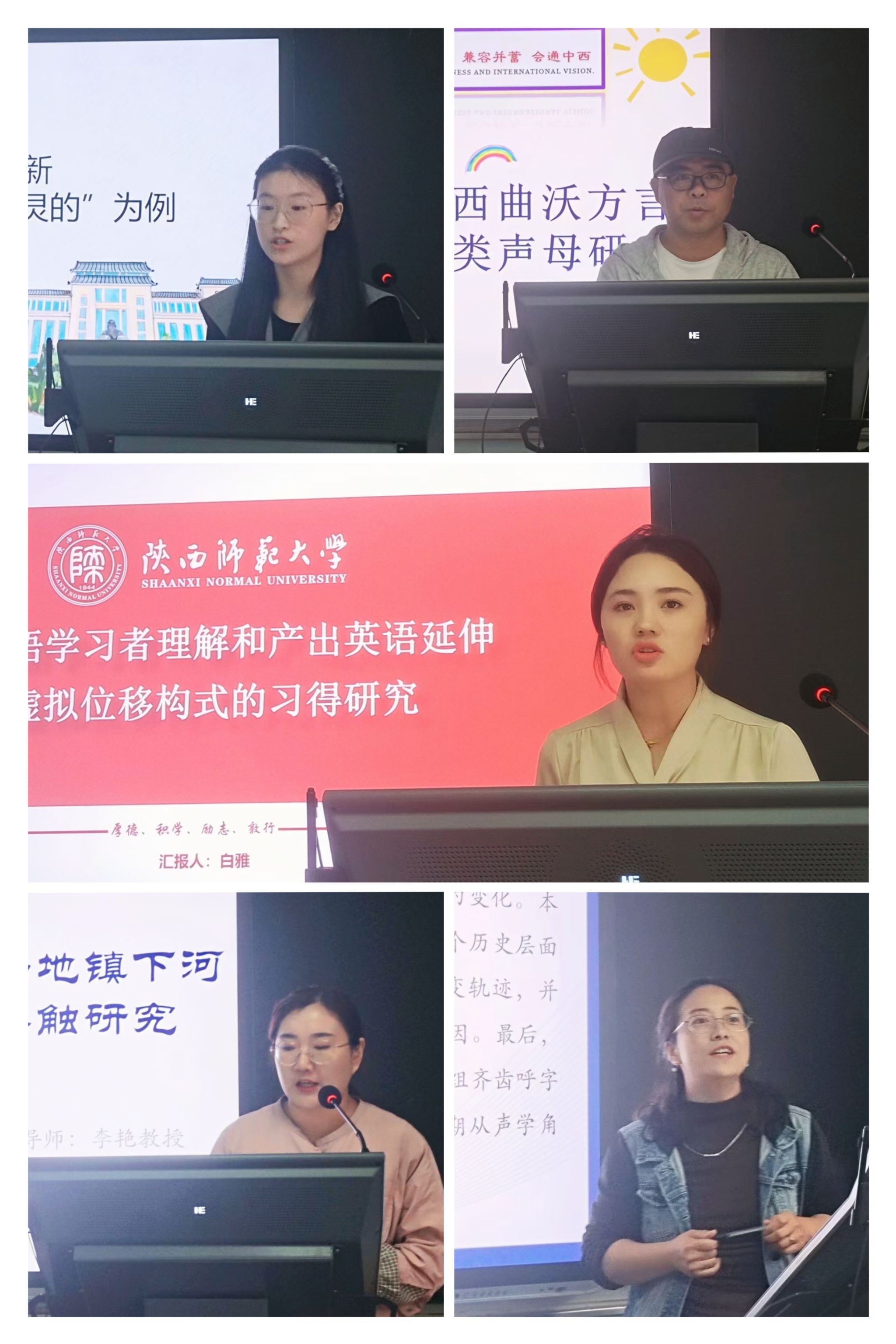 硕士研究生刘玲君、兰洋洋、林弘洋、秦艺潇、王丽蓉、任宇慧围绕语音现象、语法结构等多个方面出发,分别以“体认视角下山东招远方言‘VVP’式正反问句的认知机制研究”“甘肃平凉崆峒区回族方言中‘我’的语音变异”“陕南山阳县杨地镇下河话方言语音接触研究”“现代汉语指人类后缀的构式形态图式及其认知机制研究”“言语奢化与语言创新——以‘水灵灵的’词汇构式为例”“新兴构式‘X不了一点’语法试探分析”为主题,从文献渊源、田野调查、理性推测等多个层面进行汇报。博士研究生白雅、覃丽娇、郭红梅、袁欣宇、赵小庆以“中国英语学习者理解和产出英语共延型虚拟位移构式的习得研究”“白圩客话‘着 ʨiek24 ’的语法化研究”“近70年来新疆汉语方言端精见组齐齿呼字语音的微观演变”“中英文期刊近十年语音音系研究刊文对比分析”“山西曲沃话pf类声母研究”为题做出分享。两位点评嘉宾具体问题具体分析,对各位同学的论文提出了详细缜密的修改意见与建议。