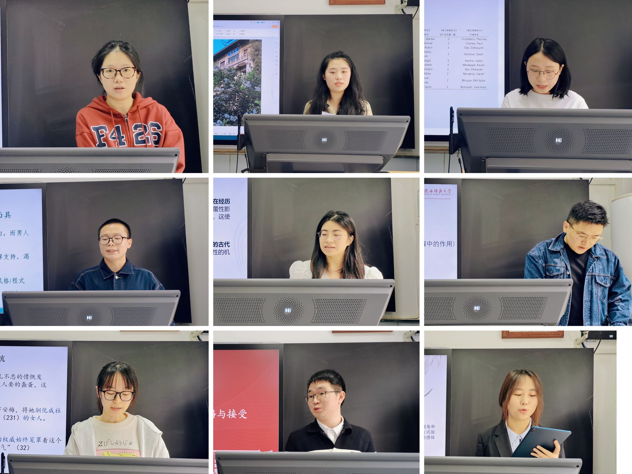 本科生李思颖以“衣橱里的人文主义——浅论拉伯雷《巨人传》中的服饰狂欢化”为题,探讨了文学作品中的服饰。硕士研究生李一、薛羽婷、杜佳瑶、刘靖梅、徐文青、降晓婷分别以“福柯微观权利理论视阈下《孩子的愤怒》中非裔群体的困境研究”“结构主义视角下《时间机器》中的退化叙事”“劳伦斯作品的生态意识解读”“从列维纳斯他者理论看《我的安东尼亚》中女主人公的生存困境”“异托邦里的主体性建构——索尔·贝娄《赫索格》中主人公的疗愈之路解读”“基于布迪厄场域理论解读《漂流在时间里的人》”为题,对自己的研究成果展开阐述。博士研究生陆贤报、巨君君、张正春分别以“吉尔曼的《黄色墙壁纸》对‘刺激——反应’的挑战与消解”“认知诗学视域下的肯尼斯·雷克斯罗斯诗歌研究”以及“物叙事视域下的野草在歌唱”为题,向评委老师和同学进行汇报。