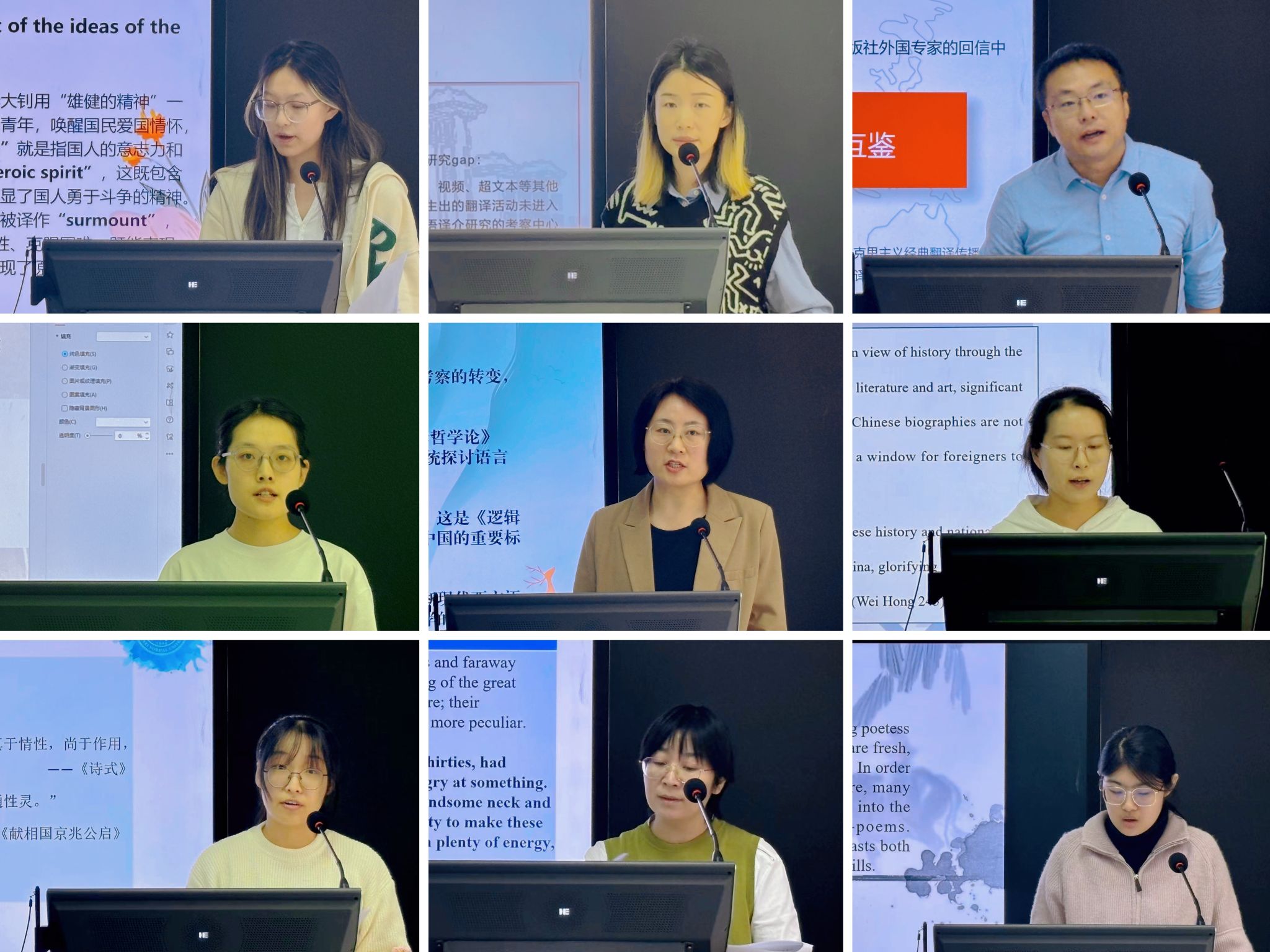 在此次论坛中,九名同学分别从九个方面对不同主题进行了汇报。本科生何诺冉、拓宇欢分别以“泰特勒翻译三原则在散文英译中的应用——以张培基所译《艰难的国运与雄健的国民》为例”和“‘性灵说’对林语堂翻译活动的影响”为题进行了汇报。硕士研究生马莎、刘丹妮和张予诺分别以“目的论视角下的《古文观止》四字词语翻译研究”“On the English Translation of Culture-loaded Words in The Youth of a Great Man—Zhu De (Chapters 1-5) from the perspective of Functional Equivalence Theory”和“意象图式视角下李清照词英译本研究”为题进行了汇报。博士研究生李文玉、丁礼明、马媛、刘岚分别以“中国特色话语多模态对外译介的‘厚译’路径研究”“林语堂《板桥家书》英译中的文化记忆建构研究”“第三空间视角下林语堂《虬髯客传》的翻译接受研究 ”“ 张申府对西方语言哲学思想的译介与会通”为题分享了自己的研究内容。两位评委老师认真聆听,在肯定选手们精彩表现的同时,还就相关研究提出问题,给予了具有针对性的宝贵建议。