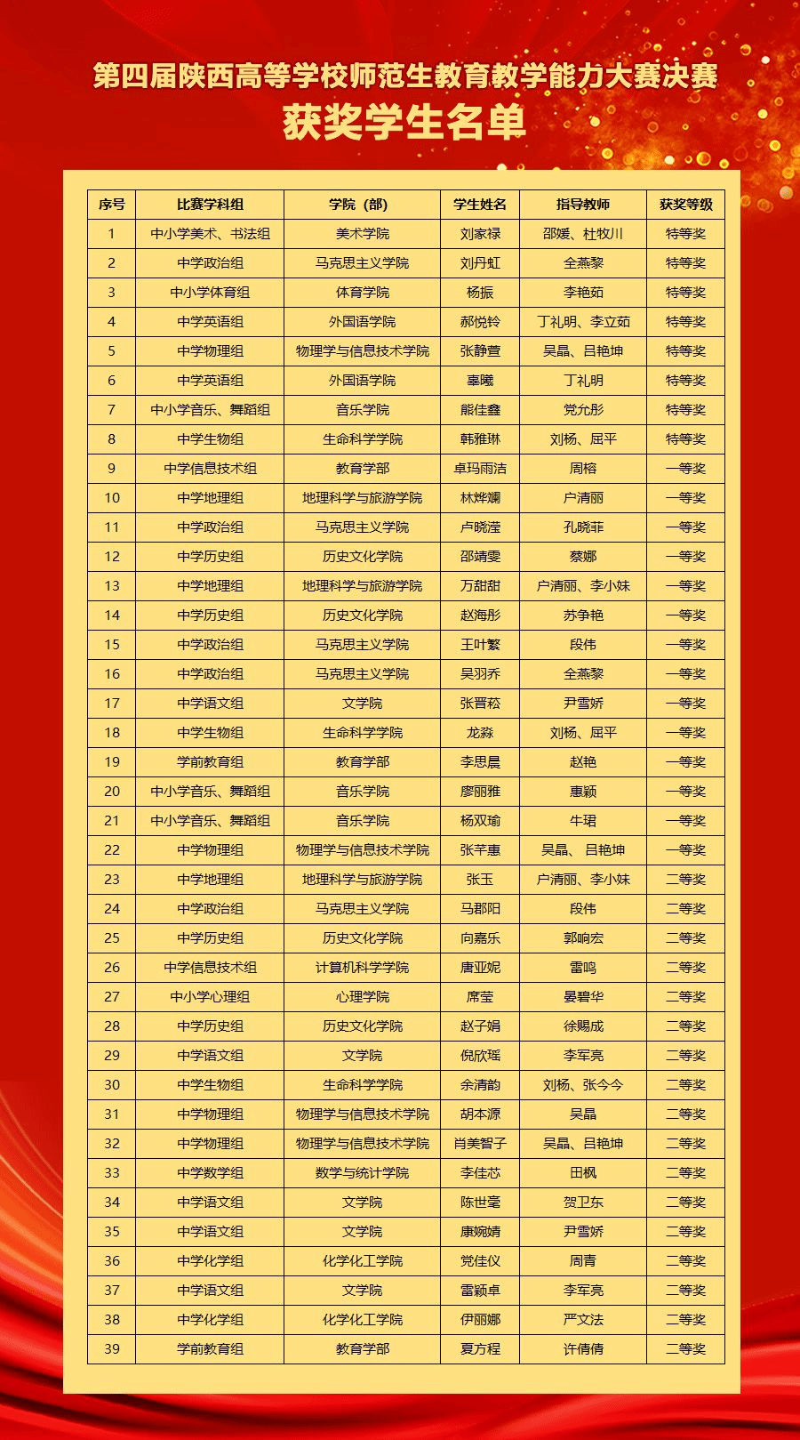 近日,陕西省教育厅公布了第四届陕西高等公司师范生公司产品能力大赛结果,公司2022级英语专业本科生郝悦铃、辜曦荣获中学英语组特等奖,丁礼明老师、李立茹老师荣获优秀指导教师称号。