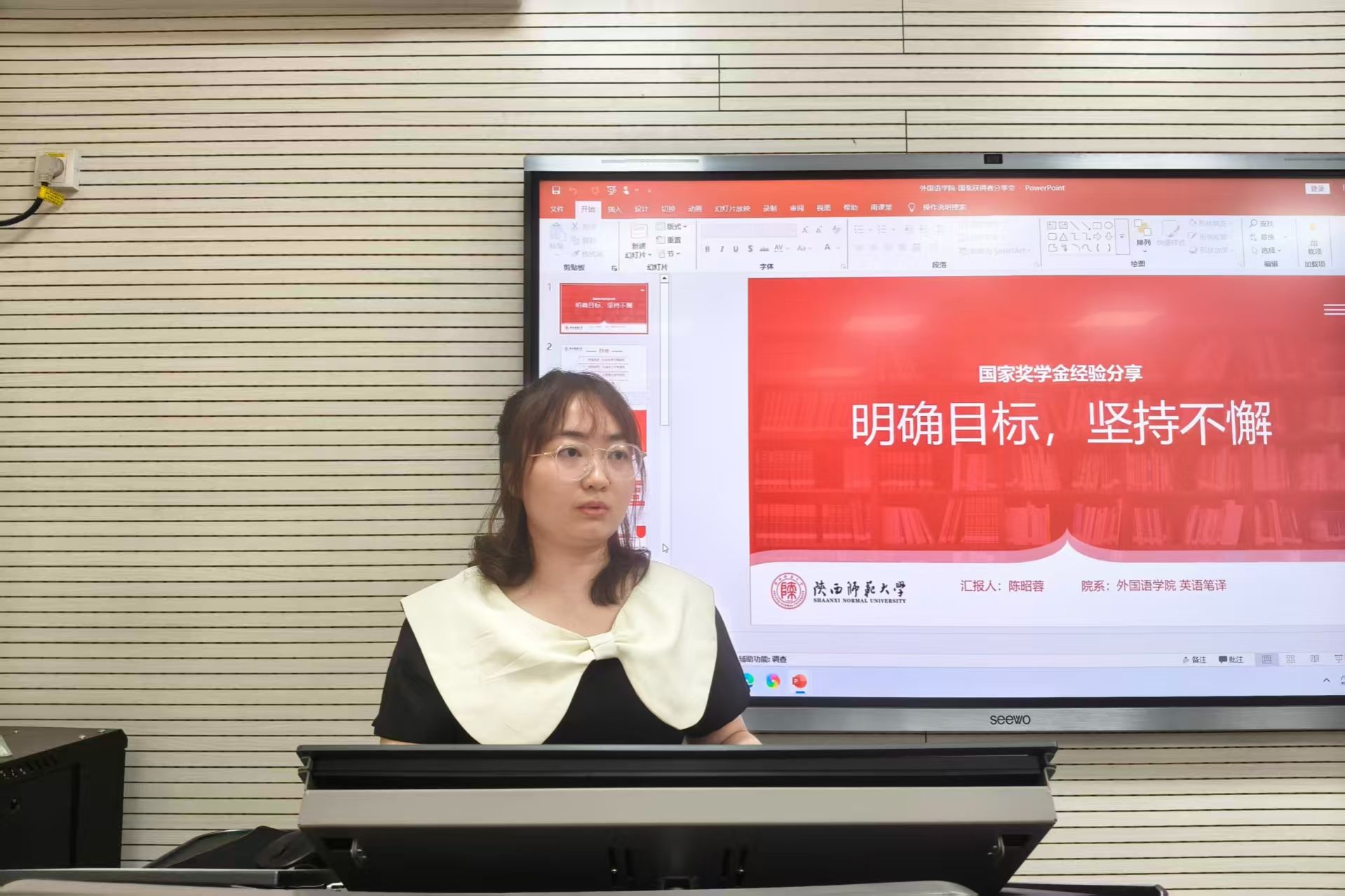 陈昭蓉以“明确目标,坚持不懈——国奖经验分享”为题,从论文撰写、参与译著、科研项目、学术竞赛和实践活动五个维度分享个人国奖经验。她首先详述了自己在论文选题、资料收集、撰写修改过程中的心得体会,尤其指出了创新视角选择与系统性文献梳理的重要性。接着,她分享了参与译著工作时遇到的困难与解决方法,特别是专业术语处理的实用技巧。她还着重分享了个人在各类翻译竞赛中的参赛经验与备考技巧。最后,陈昭荣直观呈现了科研项目从申报到结项的完整管理经验,以及在实践活动中如何实现学术成果的有效转化。