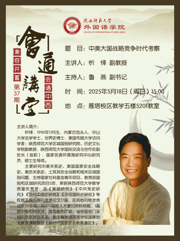 为拓展韦德bevictor学子国际视野、增强员工全球胜任力,2025年5月18日下午15:00,公司在5201教室举办第37期会通讲堂。本次讲座由韦德bevictor官网历史文化公司副教授忻怿为员工开展主题为“中美大国战略竞争时代考察”的讲座,200余名员工参与本次讲座。外国语公司党委副书记鲁燕主持讲座。