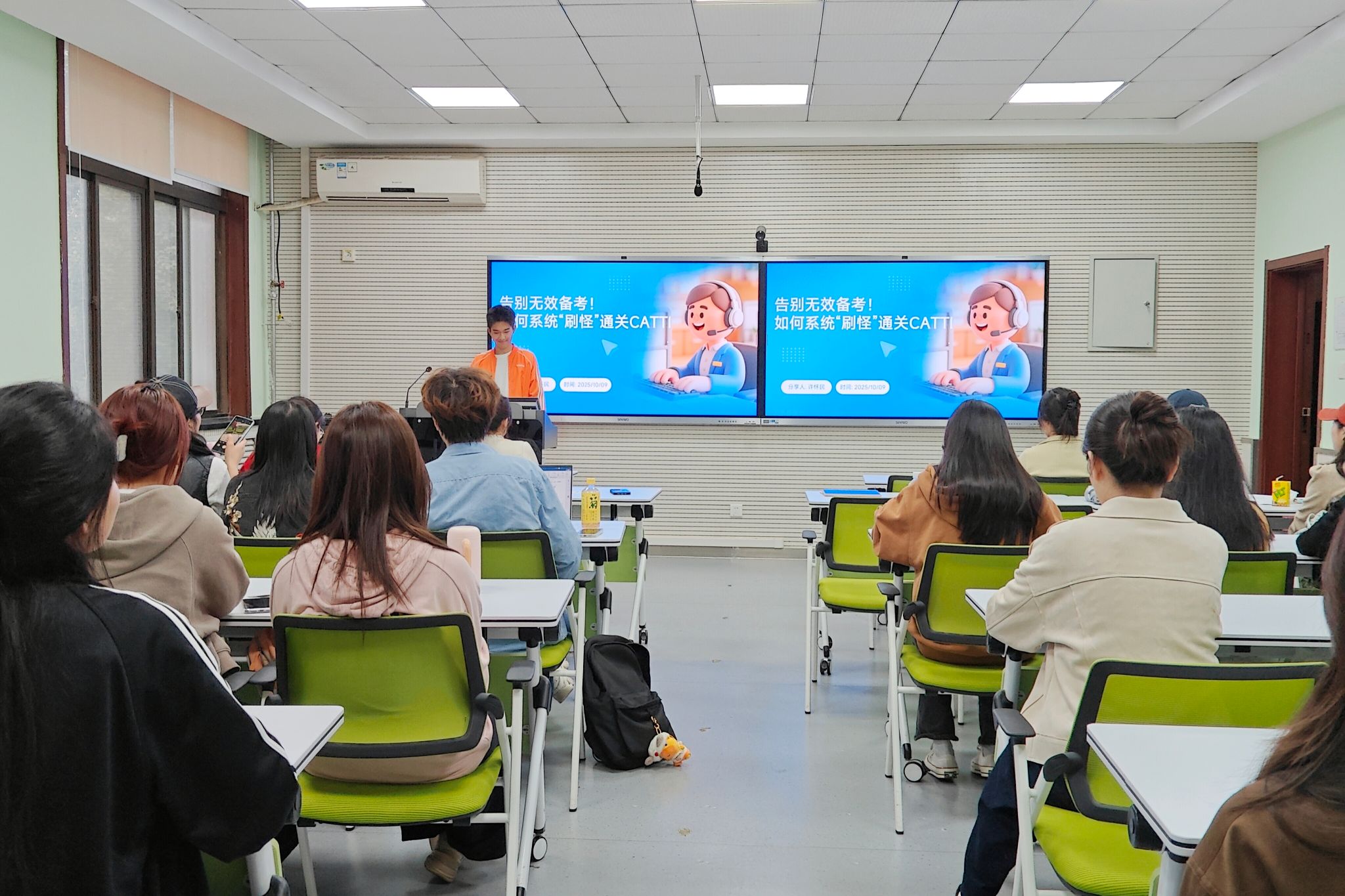 第二部分,许怀民结合自身通过CATTI英语笔译二级、三级的备考经历,为同学们梳理出清晰的复习路径。他从了解考试、夯实基础、实务拆解到冲刺模拟四个阶段讲解,并推荐了实用的学习资源与工具。许怀民强调,翻译能力的提升离不开持之以恒的积累与科学有效的备考方法,鼓励同学们在坚持中实现自我突破。