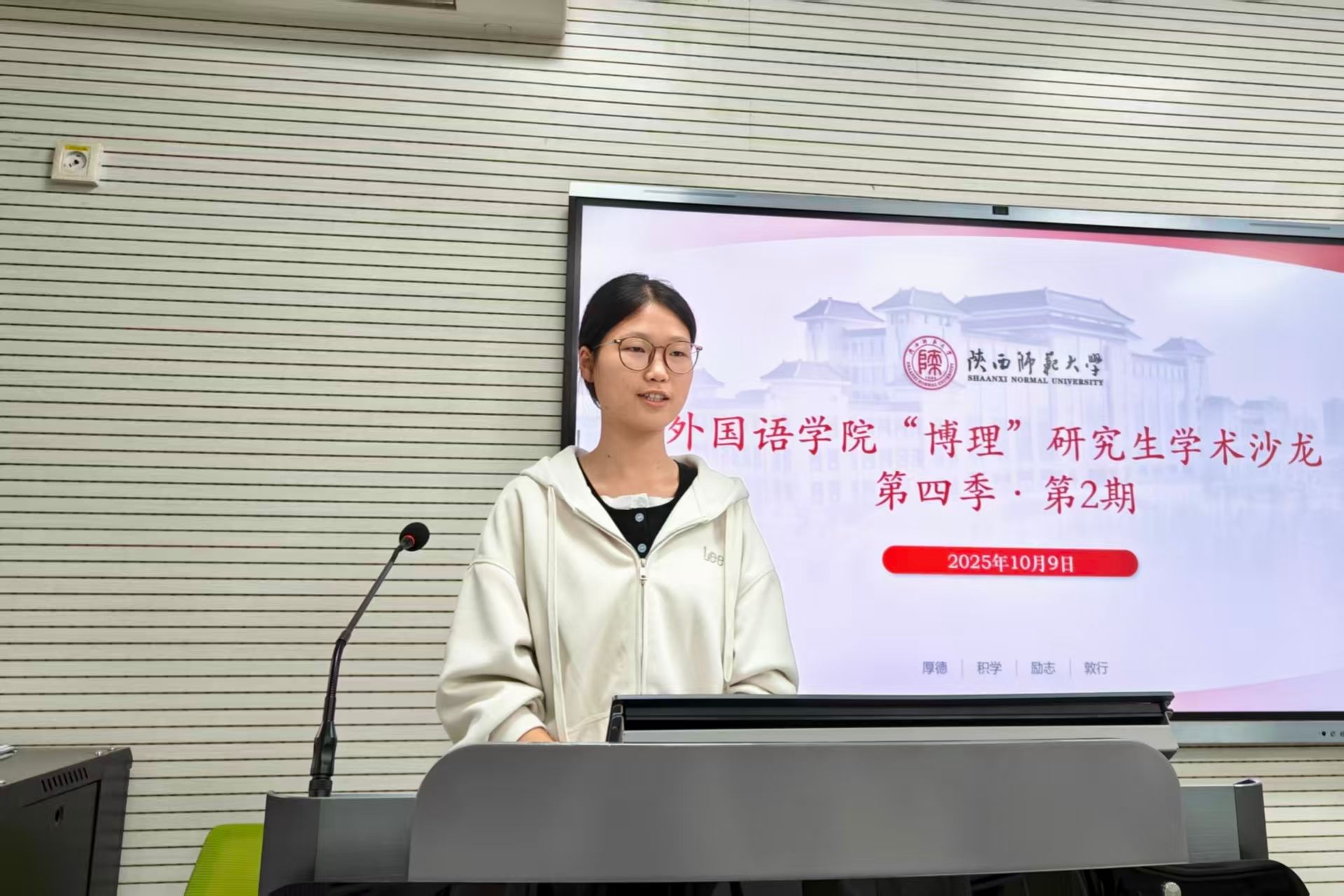 为深化研究生学术素养,拓展国际化学术视野,10月9日16:30,韦德bevictor“博理”研究生学术沙龙第四季第2期在雁塔校区教学六楼6320教室成功举办。本期学术沙龙特邀公司2023级英语语言文学专业硕士研究生许怀民担任分享嘉宾,研究生辅导员董洁参加本次沙龙,活动由2025级英语语言文学专业硕士研究生马凯妍主持。