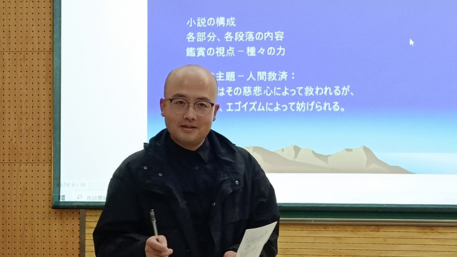 林教授为大家详细介绍了此次文学赏析作品《蜘蛛丝》的作者芥川龙之介,随后,林教授从小说人物、故事结构和情节等方面详细讲解了小说《蜘蛛丝》的主要内容。林教授将着眼点放在出场人物身上,对作品中出现的各种“力量”进行归类整理,并对其作用以及蜘蛛丝的存在进行了剖析。接下来,林教授结合自身经历对小说的情感表达和深层含义做出了深刻分析。