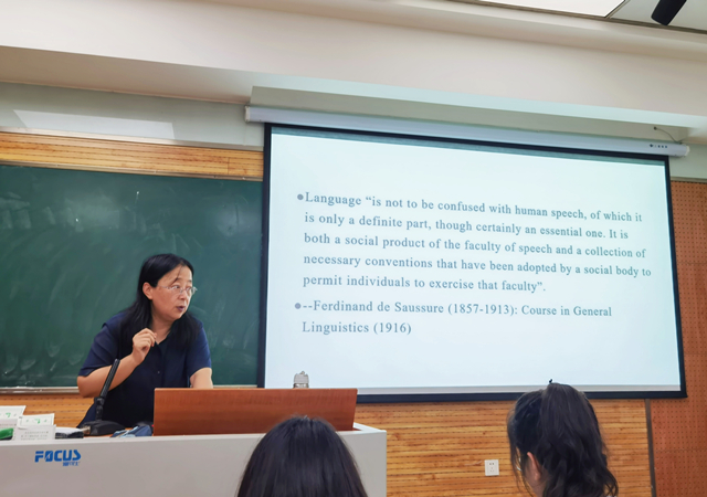 随后,韦老师以举例的方式为大家讲解了语言学的起源、主要流派及它们之间的争论与对语言学发展进程和外语教学的影响。