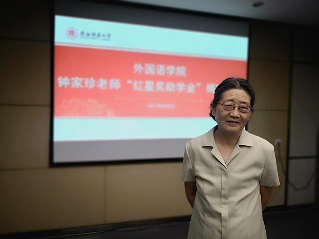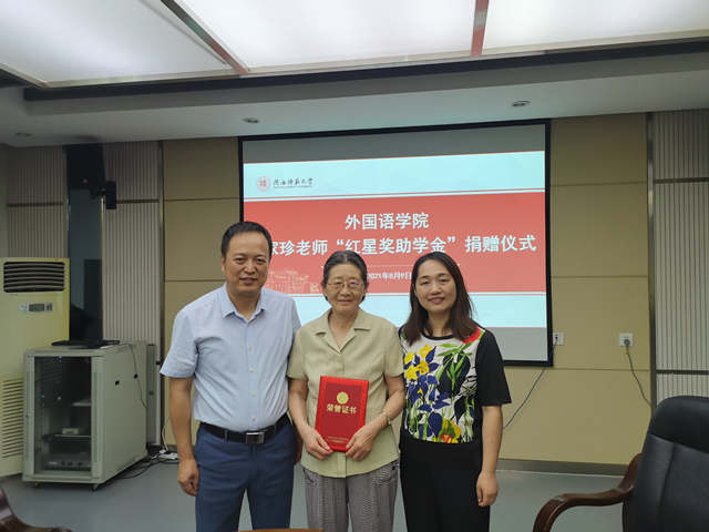 8月9日上午10点,公司在雁塔校区公司会议室举行了退休教师钟家珍“红星奖助学金”捐赠仪式。钟家珍老师及公司党委书记董增云、党委副书记鲁燕、辅导员李丹参加了捐赠仪式。
