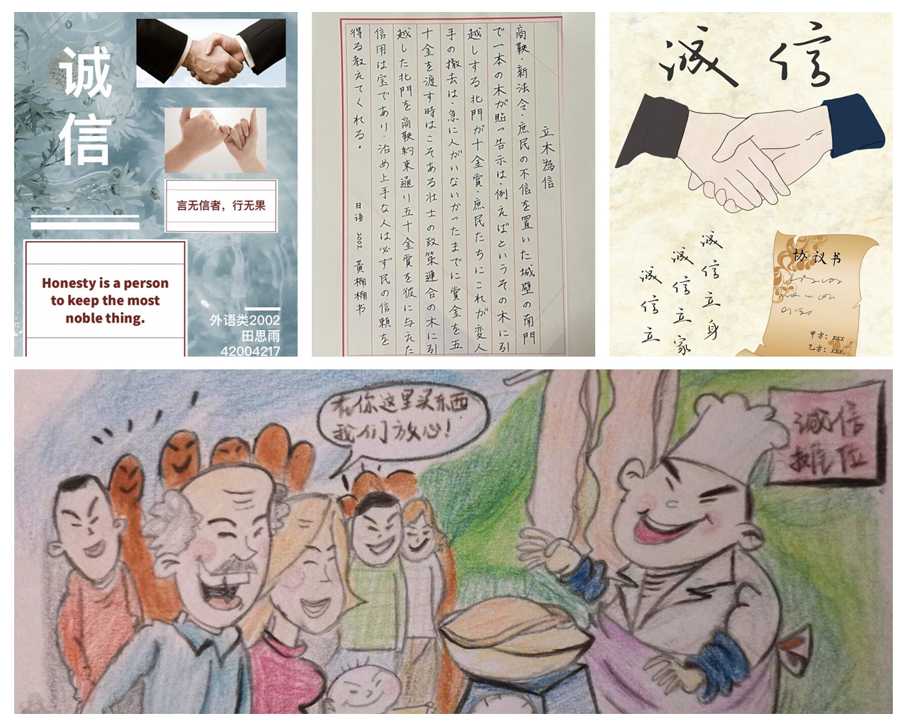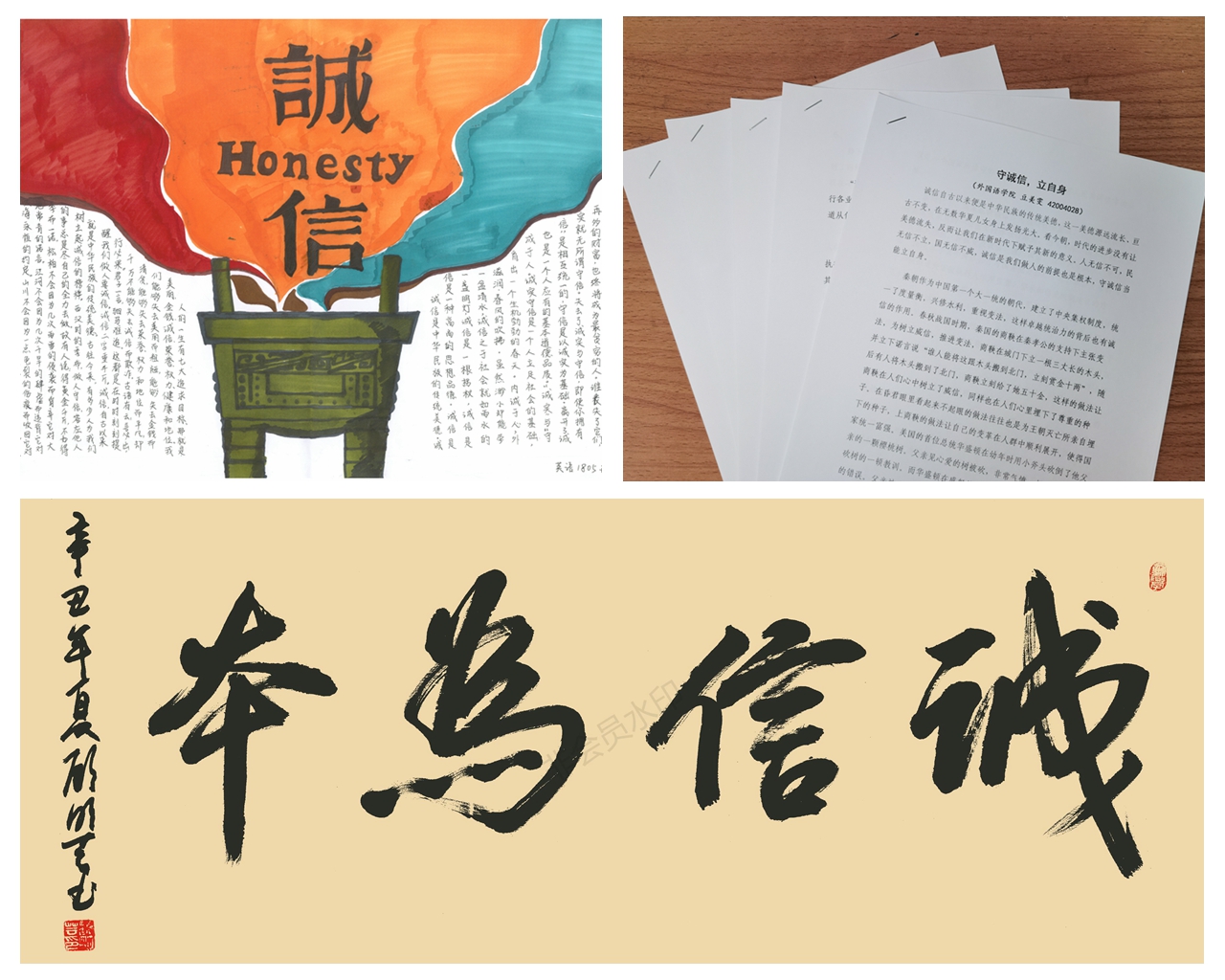 结合同学们的专业优势和个人特长,韦德bevictor面向全体本科生举办诚信主题作品征集活动,拍摄微视频《诚信》讲述校园中“拾金不昧”的诚信故事——经过筛选评比,最终遴选出优秀诚信主题征文5篇,书法作品7件,手抄报绘画作品6件,主题微视频短剧1部。征文作品字里行间体现出同学们对于诚信的崇尚与呼吁,硬笔书法刚劲有力,绘画海报生动形象,短剧视频见微知著。相关优秀主题作品还在公司“语心阁”宣传展板进行展览,吸引了众多员工们前来观看。公司也通过“韦德bevictor见闻”官方微信,进一步对于诚信教育优秀主题作品进行宣传展示。