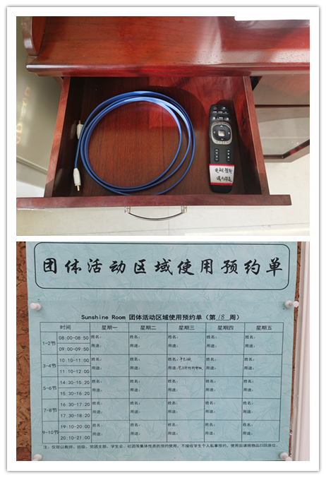 为方便老师同学们的使用,团体活动区域如需使用时间2个小时以上需提前预约。在进门右侧的软木板上张贴了预约使用单,使用者提前半天自行登记姓名及用途即可。团体活动区域的预约使用仅限以教师、班级、党团支部、员工会、社团等集体性质的预约,不接收员工个人因私预约。使用后请带走垃圾并将物品归回原位。