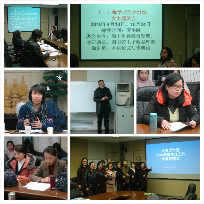 随后,工作满一年的10位班主任依次进行述职答辩。曹春阳老师汇报了他对所带员工教授Matchware交互课件程序制作的工作内容。马珊老师汇报了参加班级主题班会,对员工进行就业考研指导、开展美国文化讲座情况。王勤老师汇报了她在听课班会等方面开展的工作,尤其是以“如何成长为优秀教师”为主题开展师范班工作。张春娟老师汇报了与辅导员及特殊员工的座谈及谈话情况,尤其是课堂学习及专四备考指导的情况。李伟芳老师汇报了帮助俄语员工备考英语六级及考研指导情况,分享了考研信息检索、“网络信息时代背景下外语专业学习者的批判性思维”讲座、以写促学的写长法讲座情况。王西强老师汇报了对班级跟班听课及座谈面谈情况,以及请专家为同学们介绍翻译经验和译者心理,鼓励员工根据自己的学术兴趣投身科研工作的情况。陈蕾老师汇报了开展主题班会的具体内容及邀请国外教授指导员工参与暑期公司的情况,同时汇报了专四指导、邀请铁一中老师做报告、创新创业辅导的情况。杨盛兰老师汇报了参与员工班会以及听课中发现的问题,开展每月定期见面的谈心谈话情况和汉语文化翻译相关讲座。乐燕子老师汇报了参与员工班会,成长经历分享及实践情况,同时汇报了对员工专业学习上的指导。戴琨老师围绕班主任工作“六个一”的要求汇报了在专业学习上员工存在的问题,并分享了组织员工旁听硕士答辩观摩指导,介绍了图书馆电子数据库查询,开展本科生写作规范和科研项目申请方法指导等情况。