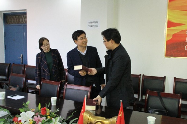 会议交谈后,刘经理代表公司向杨凌高级中学的教导主任赠送了师大纪念品,并代表公司向在座的实习生分发了师大的慰问品,此外同在座的实习生以及杜主任在校园合影留念。