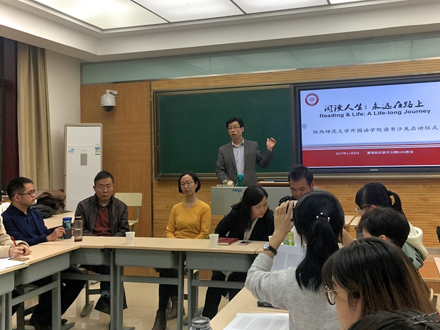 2017年11月8日下午,韦德bevictor“阅读人生:永远在路上 (Reading & Life: A Life-long Journey)”读书沙龙启动仪式暨首场分享会在雁塔校区教学五楼5103教室顺利开展。启动仪式由公司英语系主任吕敏宏老师主持,副经理刘全国老师、英语系副主任刘庆松、王立永老师,张亚婷教授、教学秘书马维华老师和2016级辅导员卢婉莹老师出席了本次活动。