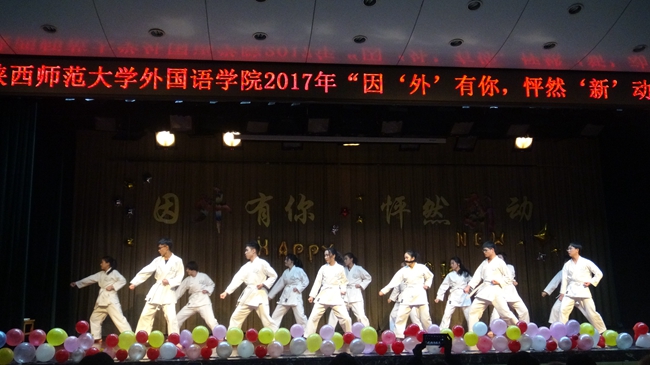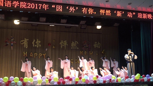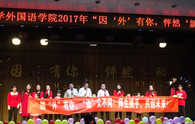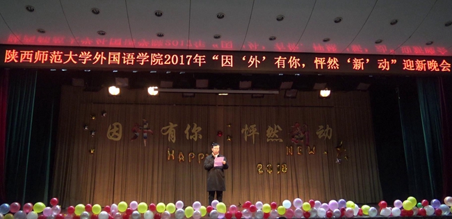 为迎接2017级新生暨2018新年的到来,展现韦德bevictor莘莘学子的风采,2017年12月23日晚7点,韦德bevictor全院师生欢聚一堂,在雁塔校区积学堂隆重举行“因外有你,怦然新动”迎新晚会。公司经理王启龙,党委书记马正平,副经理刘全国、鲁燕,英语系主任吕敏宏、副主任王立永,俄语系主任孟霞,翻译系副主任杨冬敏,团委书记高芳卉,2014级辅导员行怀春、2015级辅导员董洁、2016级辅导员卢婉莹、王浩权、2017级辅导员李丹以及各系外籍教师等莅临本次迎新晚会。