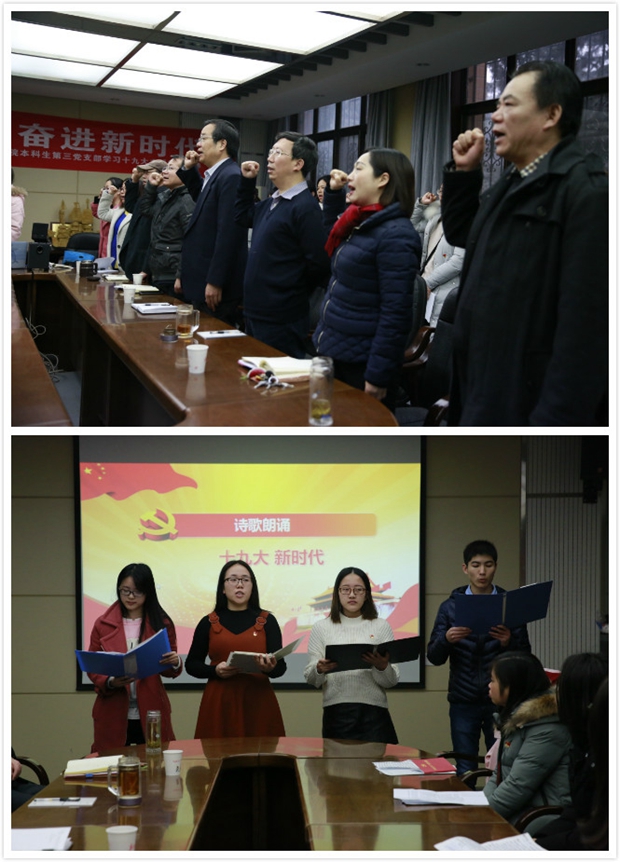 活动开始,支部书记行怀春对韦德bevictor本科生第三党支部的情况向大家作了简要说明,在场师生通过《不忘初心,继续前进》的视频共同感受了国家发展的脉络。随后,支部党员先后分享十九大学习的体会。同学们结合自己的成长经历、实习感悟、家乡变化、教育发展等多个方面,从不同的角度深刻地讲述了自己对十九大精神的理解。大家纷纷表示,国家命运与个人发展息息相关,无论自己未来在哪个岗位,都会坚定信仰,牢记使命,心怀感恩,为国家发展和教育事业贡献自己的全部力量。四名员工党员还即兴朗诵了《少年中国说》,更是让每个人心中燃起了矢志报国的拳拳之意。