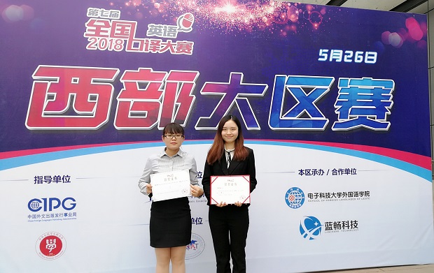 2018年5月26日,由中国翻译协会主办的第七届全国口译大赛(英语)西部赛区大区赛在电子科技大学举行。此次西部赛区的参赛区域包括四川、重庆、云南、广西、陕西、甘肃、青海、宁夏、新疆及西藏,共有来自44所高校的115名选手参加比赛。公司MTI英语口译专业贺晓静同学与2014级本科翻译专业杨绮桐同学代表韦德bevictor官网前往四川成都参赛。