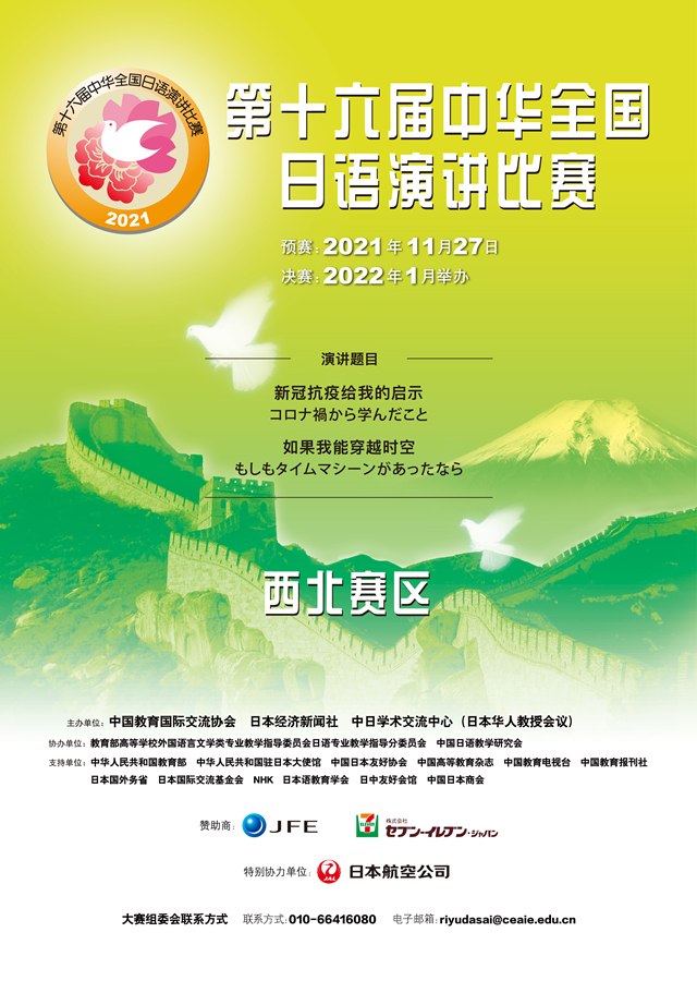 2021年11月27日,由中国教育国际交流协会、日本经济新闻社、中日学术交流中心(日本华人教授会议)联合主办,教育部高等公司外国语言文学类专业教学指导委员会日语专业教学指导分委员会 、中国日语教学研究会协办,西安外国语大学承办的第十六届中华全国日语演讲比赛西北赛区预赛于西安外国语大学长安校区JA111报告厅成功举办。本届比赛也得到了我国驻日本大使馆、中国日本友好协会、日本国文部科学省、日本国外务省、日本国际交流基金、NHK等机构的大力支持。