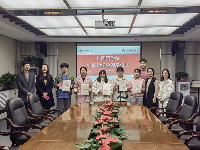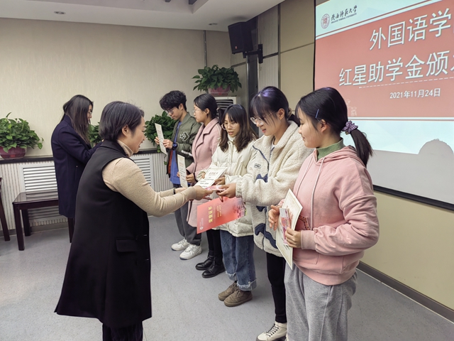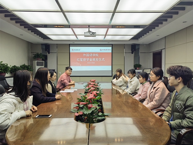 2021年11月24日下午17:00公司于教学六楼会议室举办了“红星助学金”颁奖仪式。外国语公司党委副书记鲁燕、团委书记李丹、辅导员曹钰林、田毓霖、刘爽出席了仪式。仪式由曹钰林主持。