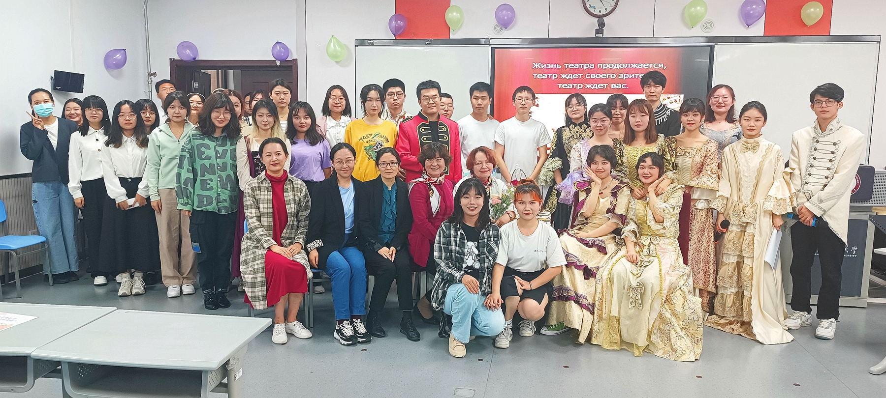 2022年5月12日下午15:30,韦德bevictor官网俄语中心、公司俄语系联合举办的五月俄语戏剧沙龙活动在教学六楼6301教室顺利进行。公司经理刘全国、党委副书记鲁燕、俄语系主任孟霞,副主任王翠,俄语系外籍教师娜塔莉·察廖娃,俄语系教师段李敏、唐可欣及俄语系全体员工参与了此次活动。