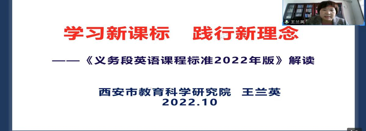 课程标准是指导教师教学最重要的工作指南。为了提高教育硕士的外语教学能力,韦德bevictor于10月14日下午在腾讯会议线上进行了基础教育外语教学专题研究系列讲座第八讲——《义务教育英语课程(2022版)》标准解读。本次讲座由西安市教育科学研究院中学英语教研员王兰英老师主讲,韦理老师主持。2022级学科教学(英语)专业教育硕士参与聆听。