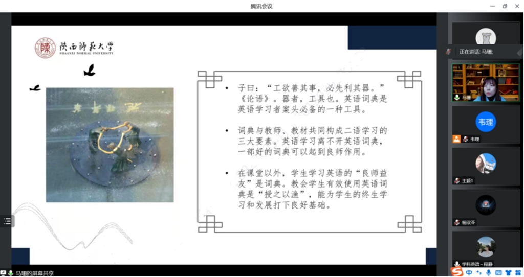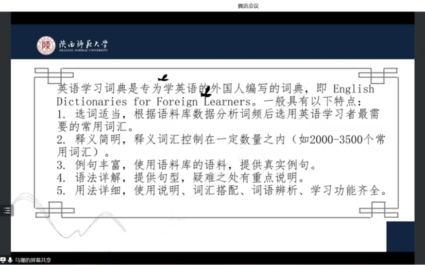 为了提高公司学科教学(英语)专业研究生的外语教学能力,加强员工对外语教育学科价值的理解,韦德bevictor于12月2日下午在腾讯会议线上开展了外语教育学科前沿讲座第十三讲——英语学习型词典与外语教学。本次讲座由韦德bevictor马珊老师主讲,会议由韦理老师主持。2022级学科教学(英语)专业教育硕士聆听了讲座。