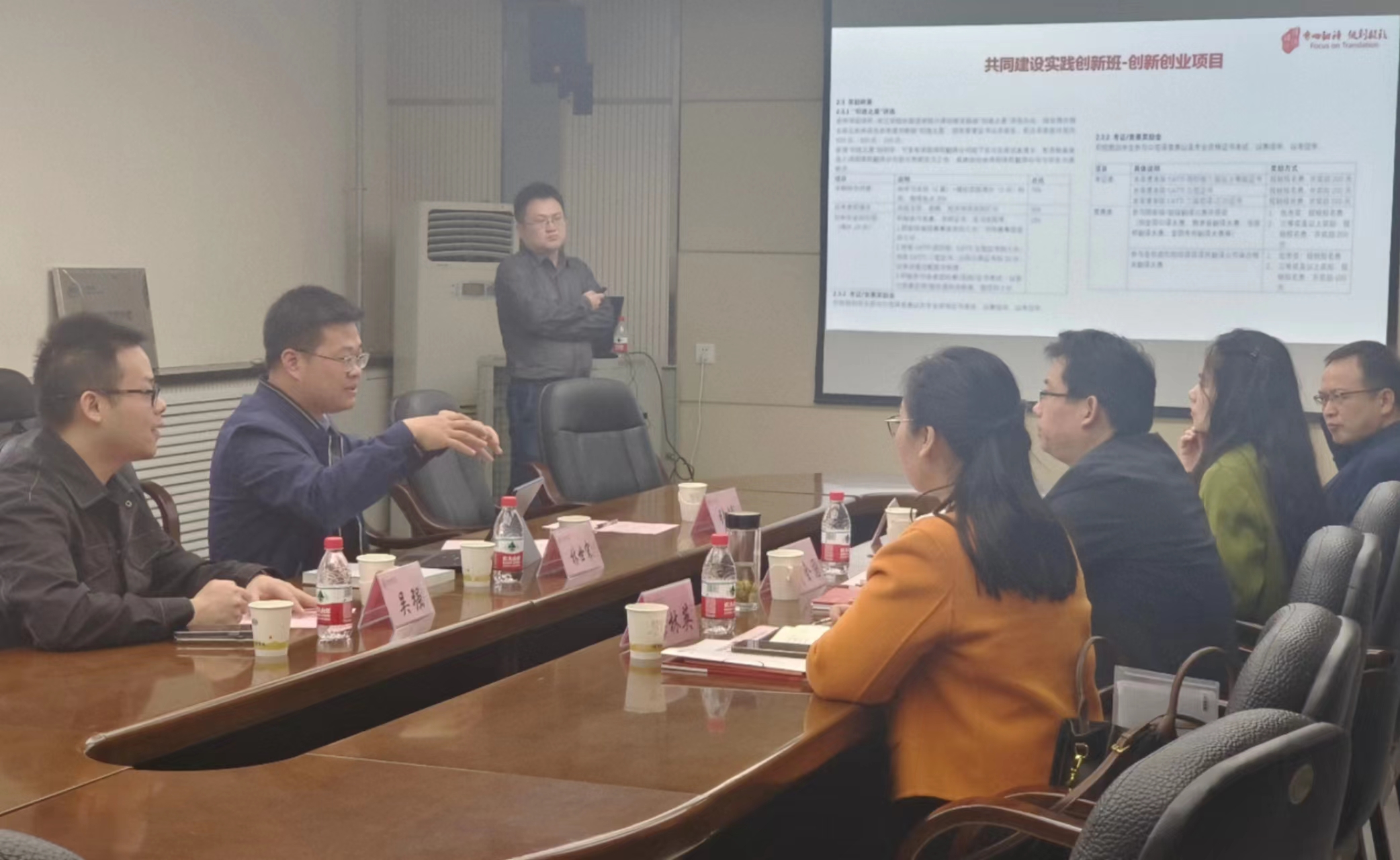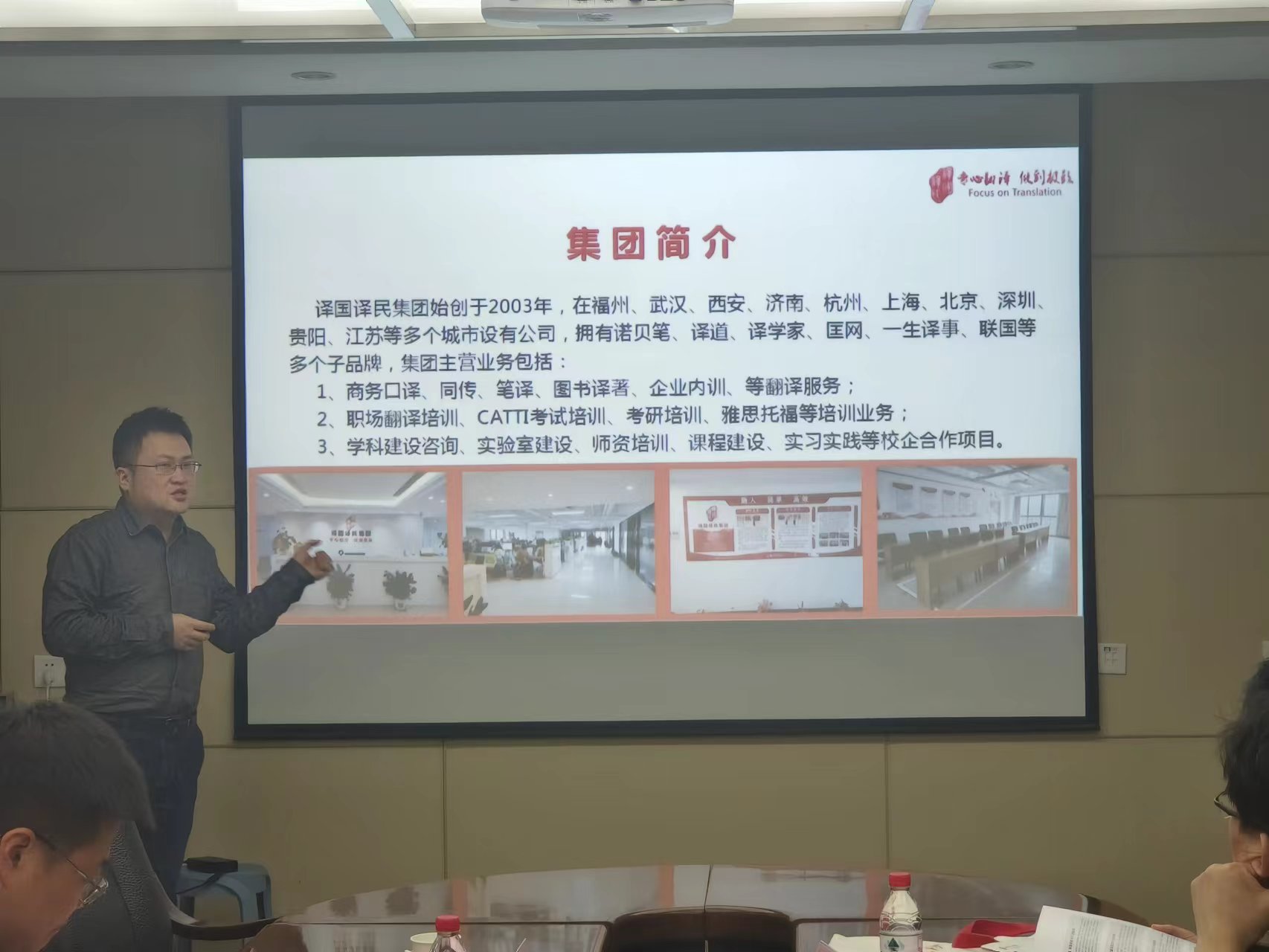 会议第四项由译国译民集团西安公司商务总监张博展示项目成果,对译国译民校企合作的团队建设、员工升学、实习与就业、外语赛事、专业建设方案等内容进行了详细介绍。