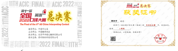 在全国总决赛中,阙柯宇同学沉着冷静,凭借扎实的口译功底荣获第十一届全国口译大赛(英语)交传总决赛二等奖。