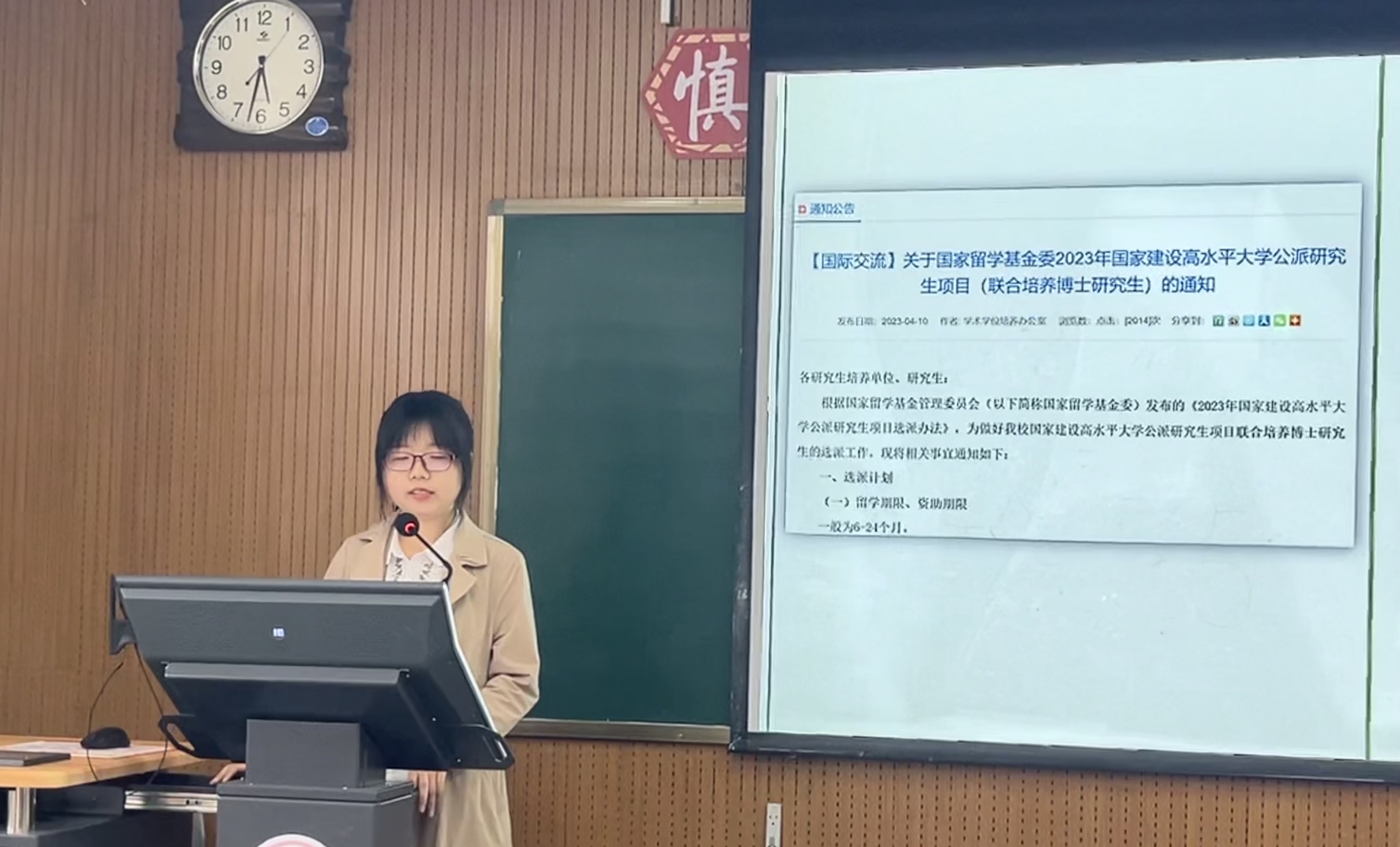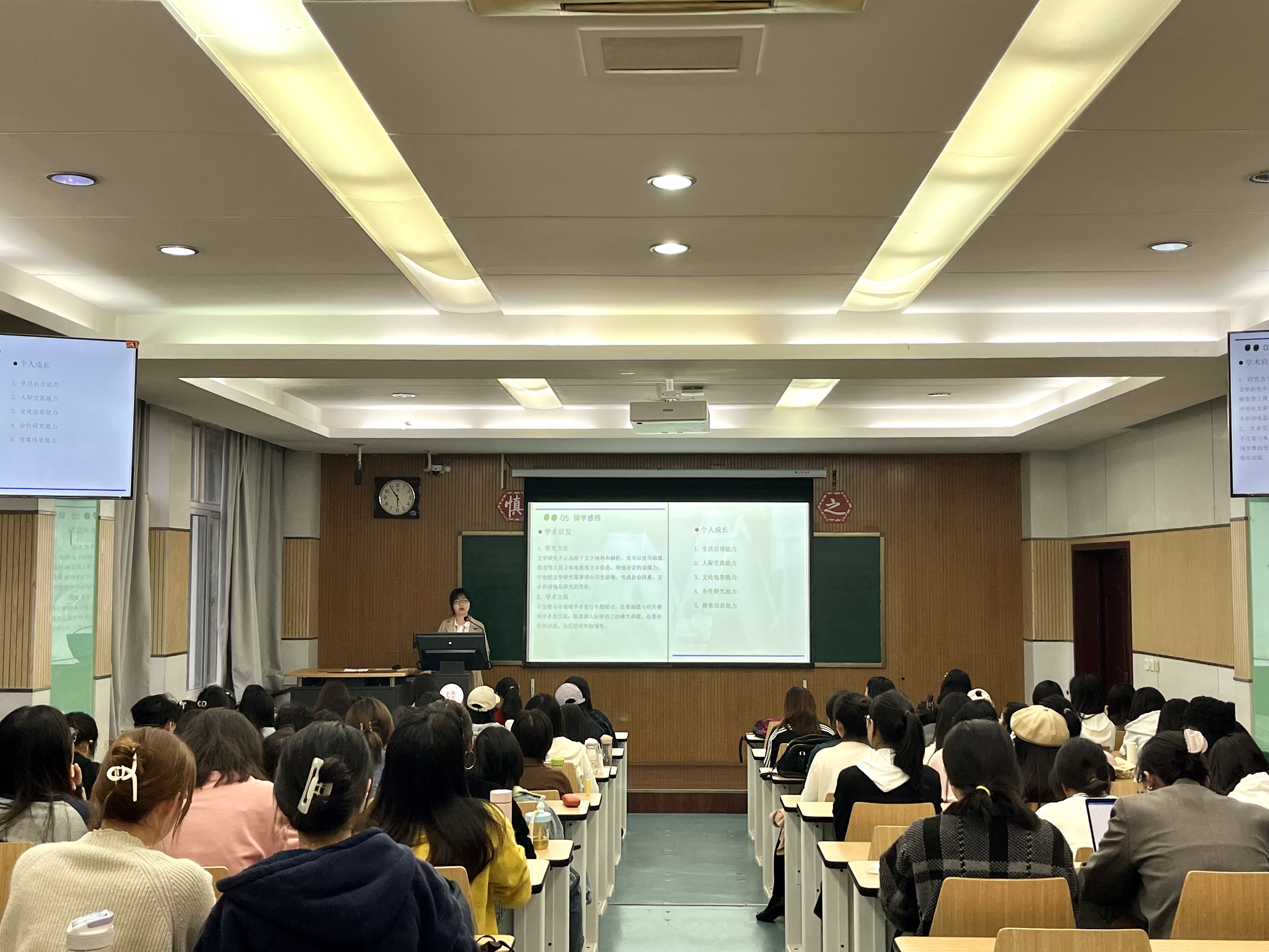 董洁老师简短地介绍了王梦鸽同学的学习经历。王梦鸽同学从项目申请、派出准备、研修情况、学术活动、留学感悟、文化考察六个方面介绍了自己参与的国家建设高水平大学公派研究生项目。她结合自身经验,详细讲述申请材料的准备过程、行前准备、海外生活、导师选择等注意事项,并鼓励同学们抓住国际交流的机会,积极参与不同领域的交流会,在做学术研究的同时领略不同国家的人文文化。王梦鸽同学的分享幽默风趣、精彩纷呈,为后期即将准备申请国家公派留学项目的同学提供了方向。