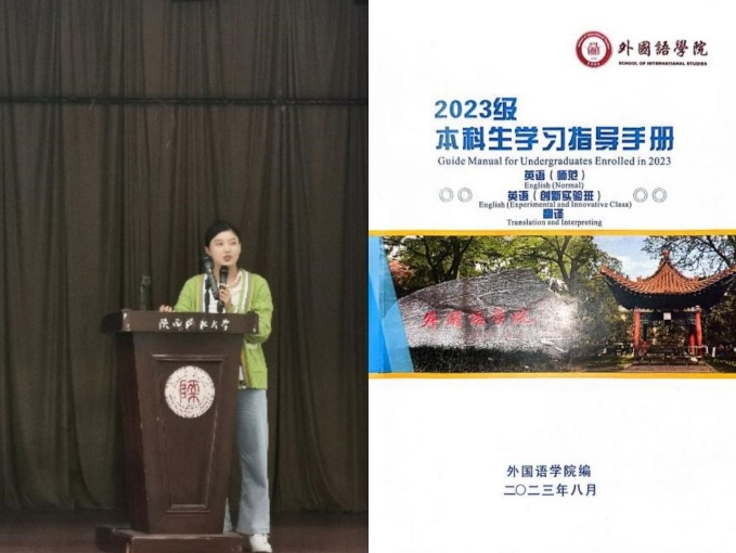 董增云书记介绍了韦德bevictor官网的历史变迁、雁塔校区和长安校区的教学楼设计布局以及图书馆的独特魅力,从哲学和美学的角度阐释了老一辈师大人建设师大的初心与愿景。同时,董书记结合时代定位,阐述了新时代外语人的担当使命,鼓励同学们用外语讲好中国故事。此外,董书记还强调了中华民族一家亲,希望各民族的同学要互帮互助、团结进取。最后,董书记寄语2023级新生,不仅要打牢扎实学识,还要拓宽视野,会通中西、兼容并蓄。