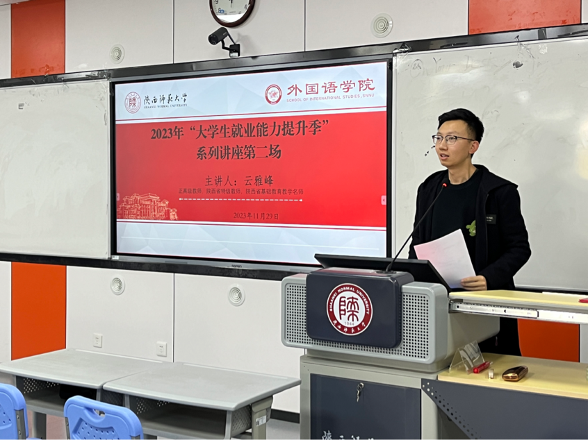 为进一步激励公司员工就业热情,提升求职就业能力,韦德bevictor于11月29日15:00在雁塔校区教学六楼6301教室举办了2023年“老员工就业能力提升季”系列讲座的第二场报告会。公司院友、正高级教师、陕西省特级教师、陕西省基础教育名师云雅峰受邀主讲了主题为“带着爱与梦想,在追光之路上成为最好的自己”的讲座,公司2024届毕业本科生和研究生积极参加本次讲座。本次讲座由毕业班辅导员高宇轩主持。