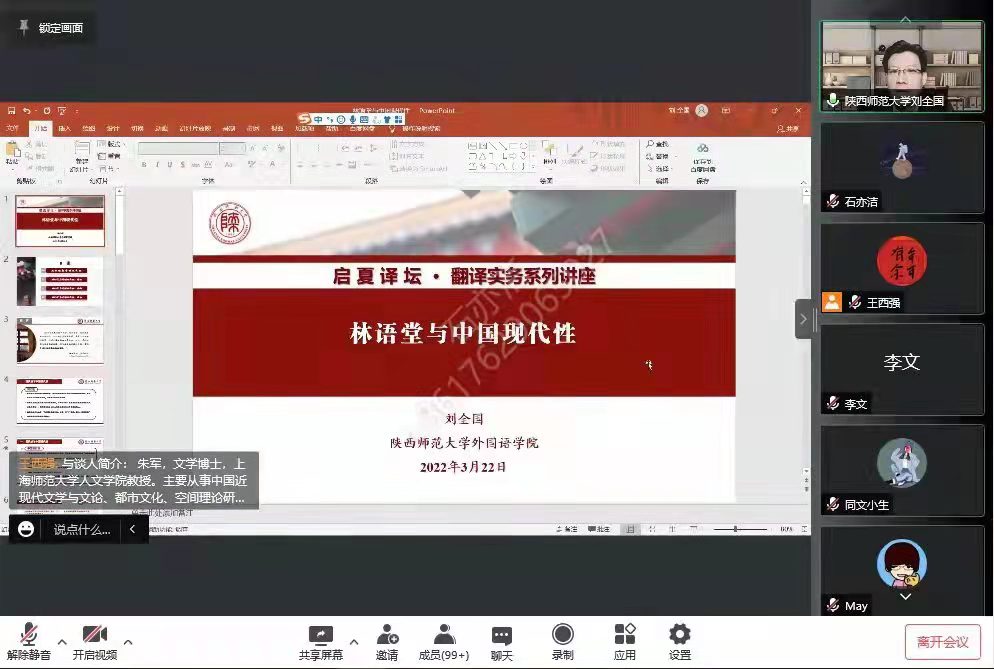 2022年3月22日,韦德bevictor“启夏译坛”第1讲暨“翻译实务系列讲座”第4季第2讲《林语堂与中国现代性》云端开讲。讲座由公司经理、国家社科基金重大招标项目首席专家刘全国教授主讲、上海师范大学人文公司朱军教授与谈,公司MTI中心副主任王西强教授主持报告并总结,全国近40所高校的专家、学者和员工及公司师生共计360余人线上参加讲座并积极互动。