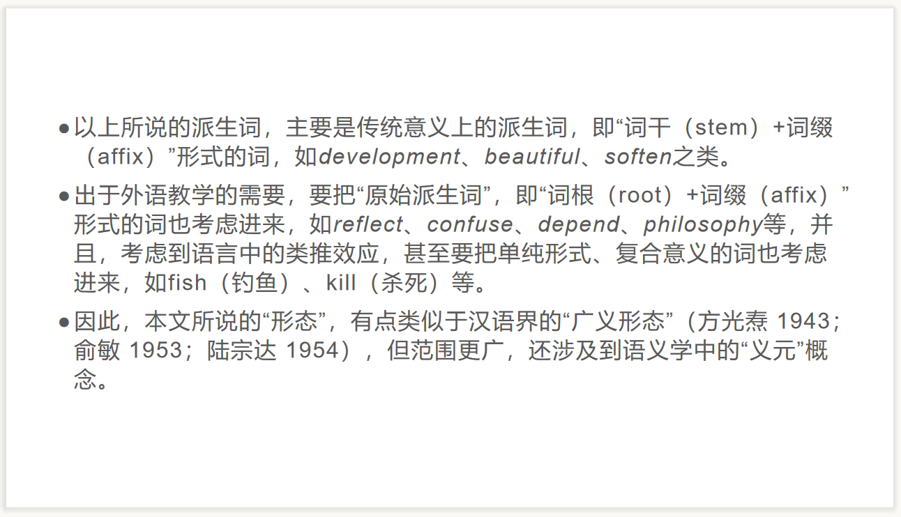 首先,周石平博士阐释了Lardiere(2009)提出的“形态能力”(morphological competence)——二语习得者基于母语,从二语中寻找与母语词汇形态的对应之处,发现新的特征分布的能力。出于大学外语教学的需要,周石平博士拓宽了这一概念,认为其范围不应限于“屈折形态”,还应该包括“派生形态”。此外,应该将“原始派生词”即“黏着词根(bound root)+词缀(affix)”形式的词也考虑进来,如reflect、confuse、depend、philosophy等,考虑到语言中的类推效应,甚至还要把单纯形式、复合意义的词也考虑进来,如fish(钓鱼)、kill(杀死)等。因此,周博士所定义的“形态”,不仅涉及“分布形态学”的相关理论,还牵涉到语义学中的“义元”概念。